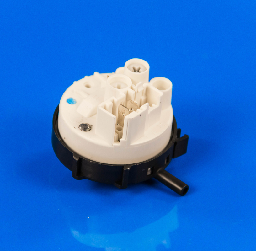 Крім того, що пресостат стежить за рівнем набору води, він ще й регулює її кількість відповідно до певної програми обраної користувачем. На вигляд такий елемент нагадує пластикове коло, до якого підключені трубки і проводи.