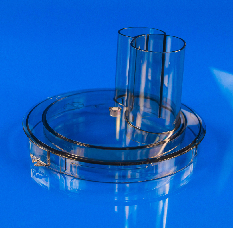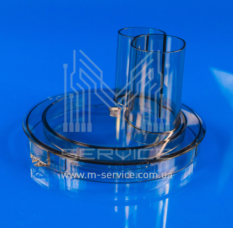 Така кришка виготовлена з високоякісного прозорого пластику. Цей матеріал легко очищається від залишків різних продуктів. Кришка має герметичну, зручну конструкцію. Вона надійно фіксується у корпусі комбайна. Таким чином, запобігається її довільному відкриванню під час роботи пристрою.
