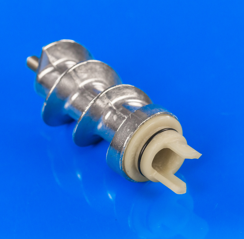 Внешне шнек представляет собой металлический винт, выполненный в виде спирали. Служит такой элемент для проталкивания продуктов вдоль корпуса мясорубки.